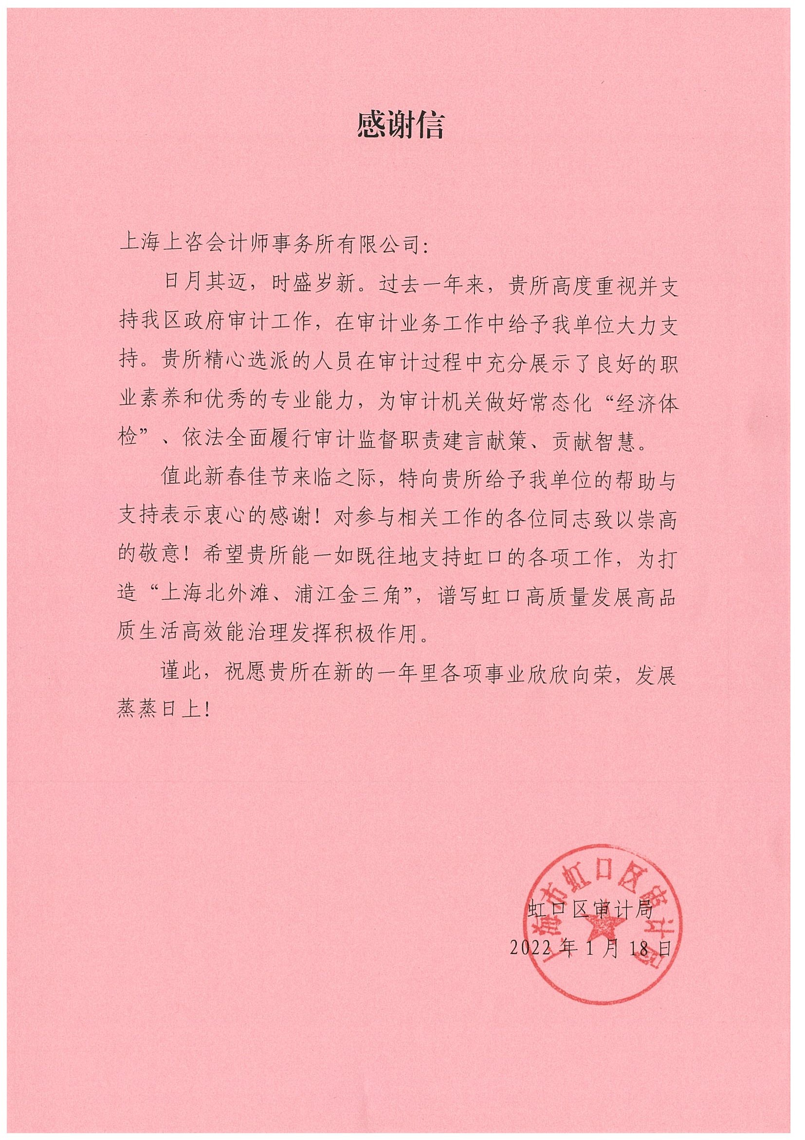 虹口区审计局的感谢信