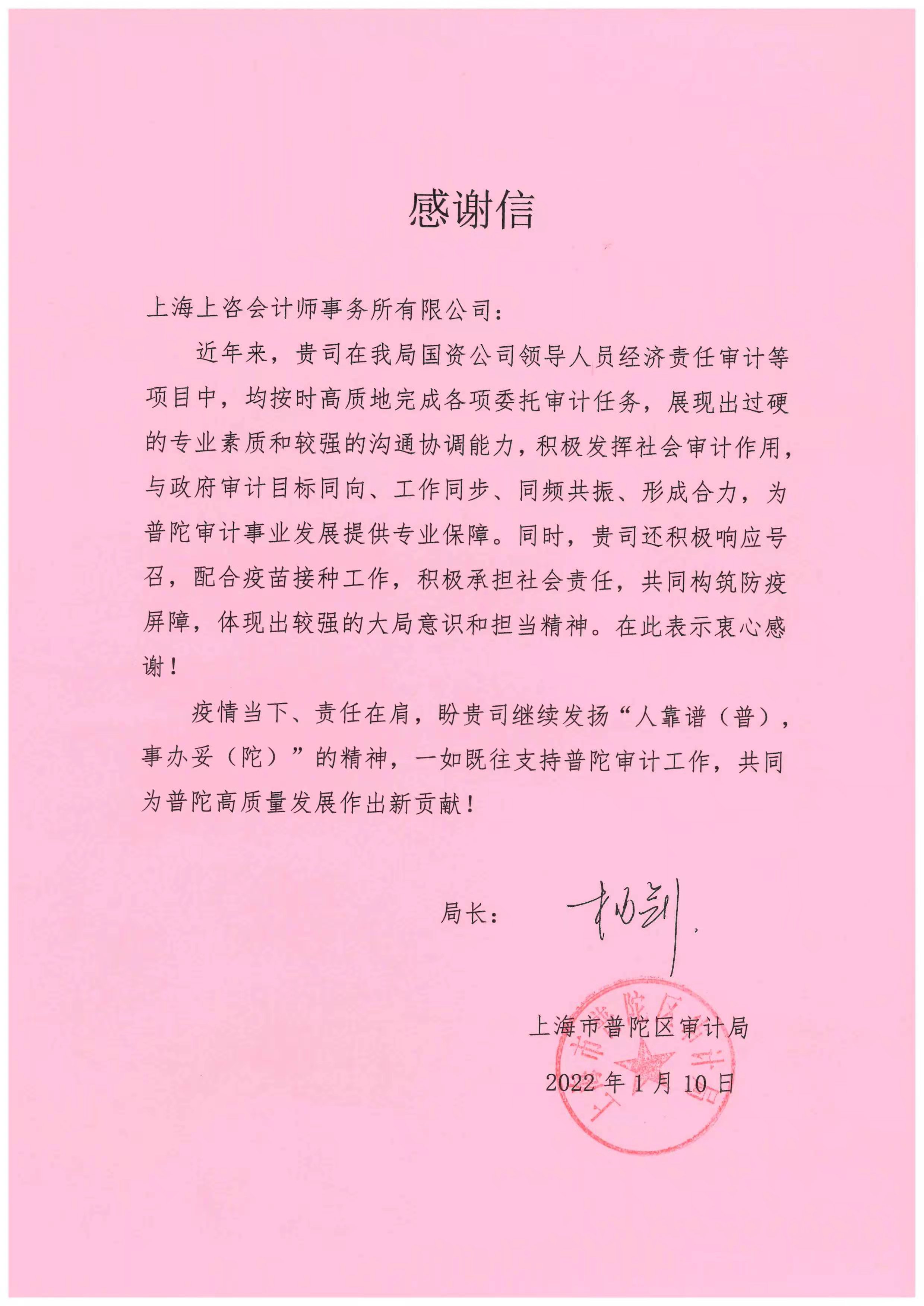 普陀区审计局的感谢信